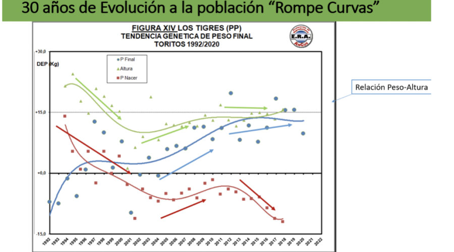 Las Curvas de crecimiento clásico, o bien los perfiles que solemos encontrar en el mercado; son el perfil de animales de alto peso al nacimiento con alto peso al destete el “toro para vaca” y por otro lado los “Toros para vaquillonas” con bajo peso al nacer y poco o bajo tamaño final. Lo que nos planteamos fue que, si había animales excepcionales que tenían un perfil con bajo peso al nacimiento, pero con buen crecimiento, era posible comenzar a seleccionarlos para aumentar la frecuencia de animales con ese mismo perfil.